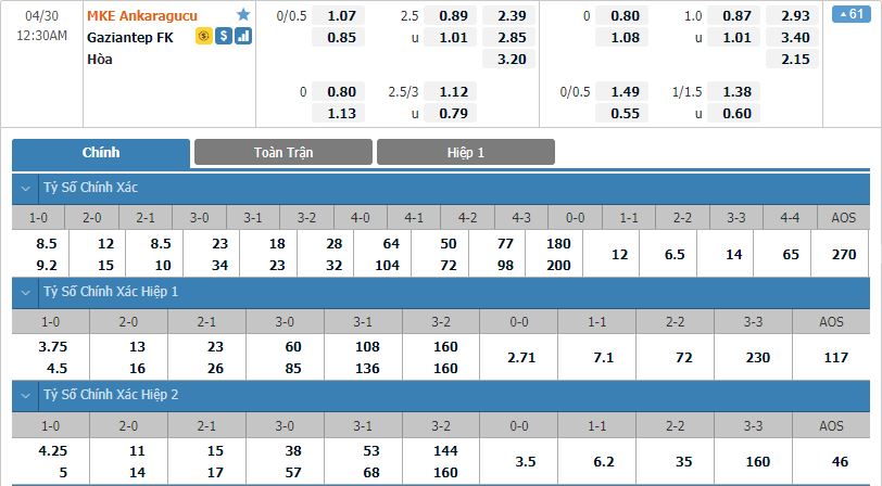 - Kèo tỉ số hiệp 1: Ankaragucu 1-0 Gaziantep FK