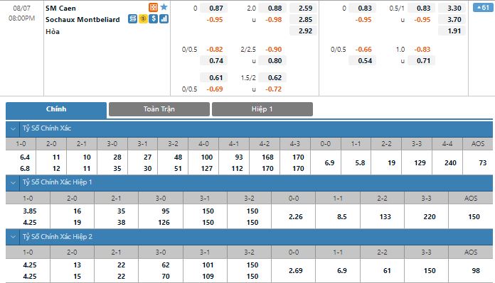 Bảng tỷ lệ kèo trực tuyến trận đấu Caen vs Sochaux: