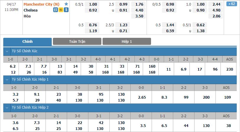Bảng tỷ lệ kèo trực tuyến trận đấu Chelsea vs Manchester City