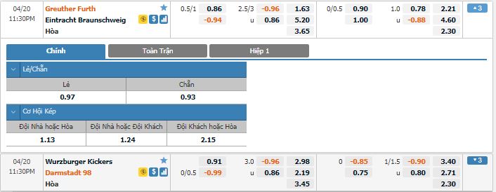 Bảng tỷ lệ kèo trực tuyến trận đấu Greuther Furth vs Eintracht Braunschweig: