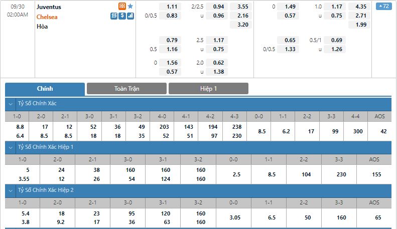 Bảng tỷ lệ kèo bóng đá Juventus vs Chelsea
