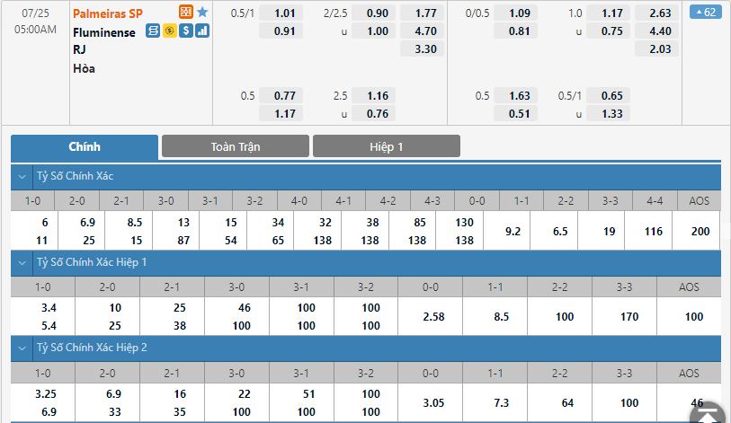 Bảng tỷ lệ kèo trực tuyến trận đấu Palmeiras vs Fluminense