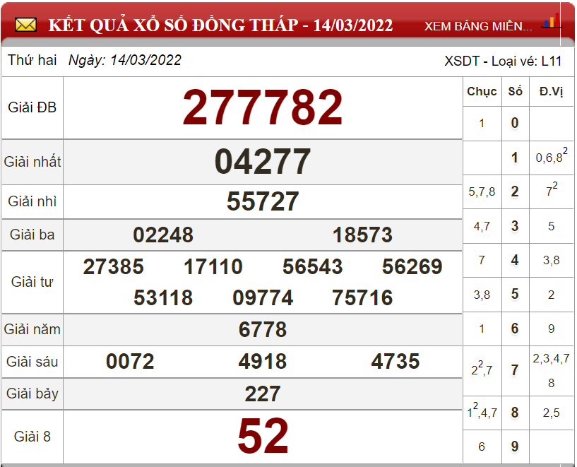 Kết quả lô đề theo xổ số Đồng Tháp ngày 14/03/2022