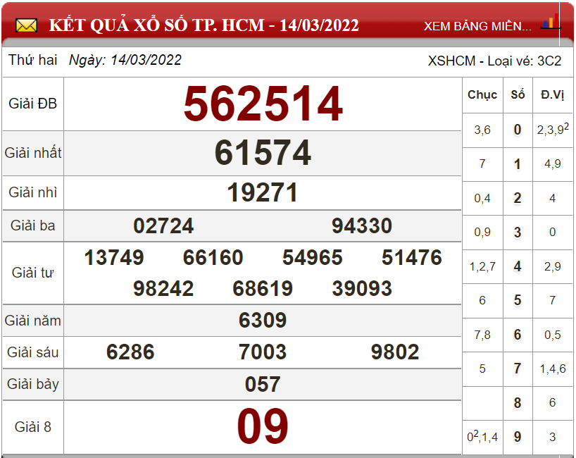 Kết quả lô đề theo xổ số TP.HCM ngày 14/03/2022