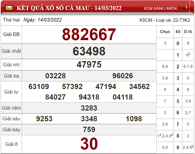 Kết quả lô đề theo xổ số Cà Mau ngày 14/03/2022