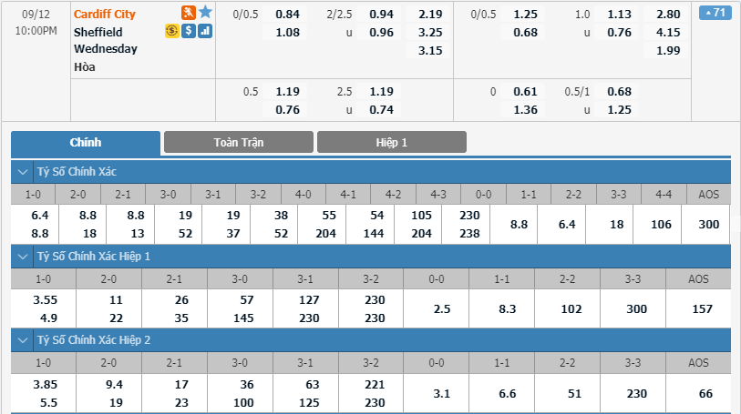 - Kèo tỉ số hiệp 2: Cardiff 1-0 Sheffield Wednesday