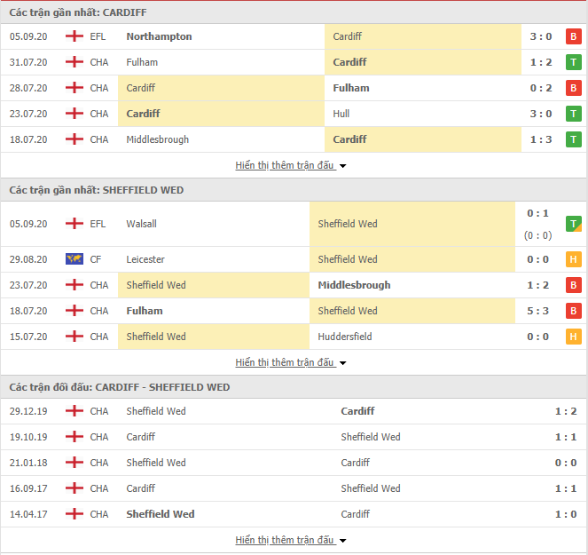 Phong độ gần đây & Thành tích đối đầu Cardiff vs Sheffield Wednesday
