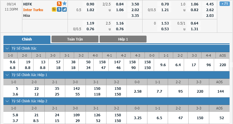 - Kèo tỉ số hiệp 2: HIFK Elsinki 0-1 Inter Turku