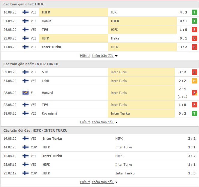 Phong độ gần đây & Thành tích đối đầu HIFK Elsinki vs Inter Turku